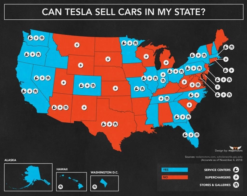 比如,直到今年年初,2020年了大人,特斯拉才通过长年的诉讼,赢得了在密歇根州开第一家直营店的机会。此前密州买家是要跑到隔壁州去买车的,车主如果要进行什么维保和服务,也要跑到隔壁州。