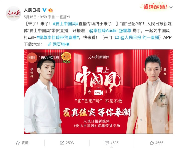 不过与圈内人使用不同,圈外人在使用时含义已经有一些变化了,比如最近人民日报推出的「爱上中国风」直播专场,这个偶像应援才使用的「打 CALL」,在这里变成了对中国风的加油和祝福。而这个含义的改变,并不在粉丝圈内人控制范围。
