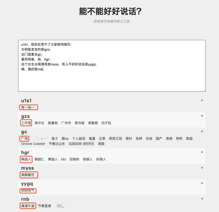 先进行一个简单的翻译吧。cqy>处 Q 友,加 QQ 好友;cgx>处关系,不是情侣,而是爸妈姐弟闺蜜兄弟之类;nss>暖说说,可以理解为帮点赞、评论说说等;cdx>处对象,嗯,网恋。看着这些缩写满脑子「这都是些什么」的人不止我一个,微博网友@卜卜口 制作了一个名为「能不能好好说话」的网页,功能很简单,就是帮我们理解缩写的含义。