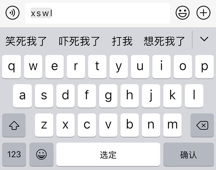 这些看起来简短的拼音缩写,其实并不方便。拿出手机,输入「xswl」,就会出现「笑死我了」、「吓死我了」、「想死我了」等候选词。比起直接选择输入,切换到英文输入并没有多便捷,那读出来呢?不论是「艾克斯埃斯达不溜爱楼」还是「西斯乌了」,一样没有提高沟通效率。