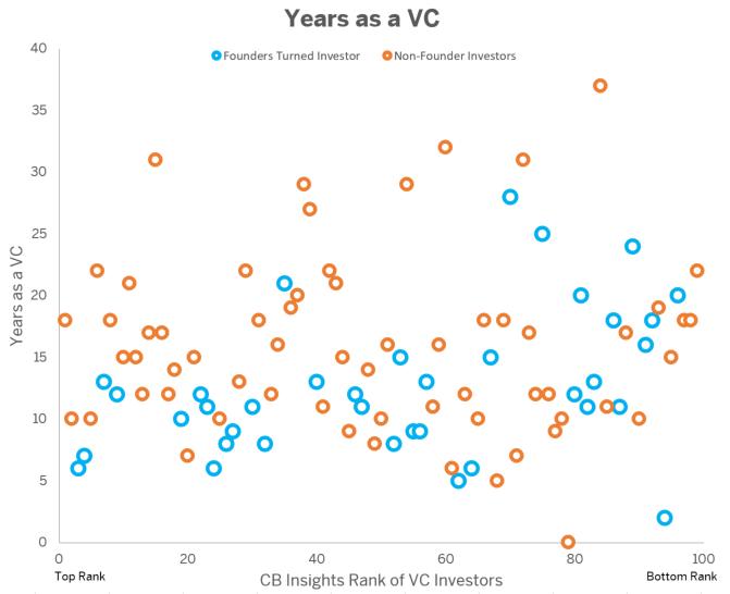 2016年开始,CB ingishts便采访数千个创业者或者投资人,以保密的形式评出“全球百大投资人”。同福布斯排行版不同不同,CB insights会对投资人的数据和背景进行量化分析。2018年他们透过研究,发现是否创立过公司,和能否跻身榜单没有相关性。100人中,有32个人创立过公司,68个没有创立过公司。排名前十的投资人,有一半以上(6个人)都没有创立过公司,甚至没有在企业里干过具体业务,数据可以见下图。