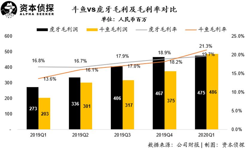 在增加带宽使用效率等一系列成本控制措施后,本季度,斗鱼在毛利润上首次超过了虎牙,本季度达到4.86亿元人民币,高出竞争对手1100万。而斗鱼毛利率也达到了历史最高的21.3%,相比上季度提升3.1个百分点,同时高出虎牙1.6个百分点。