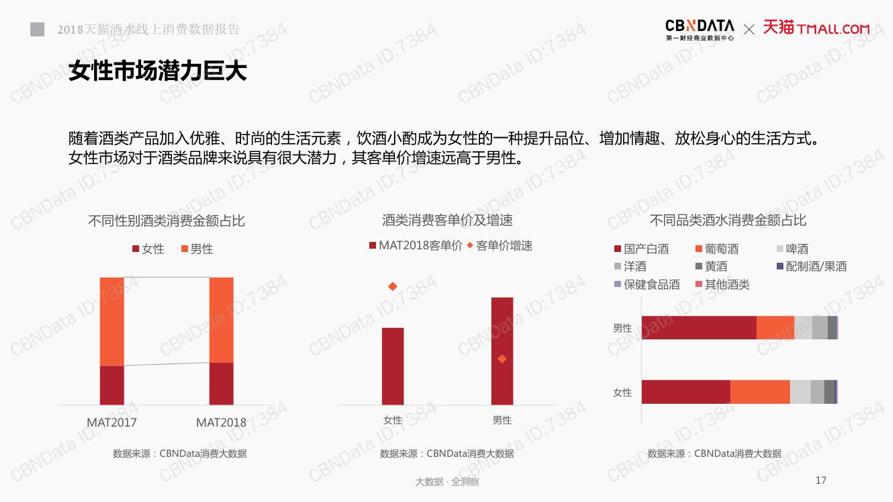 报告显示,女性酒类消费金额占比呈现增长态势,客单价增速远高于男性。