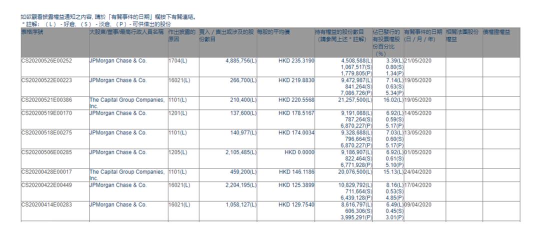 港交所股权披露文件显示,5月19日小摩增持26.67万股,每股作价219.89港元,总金额约为5864.28万港元,增持后持股比例为7.14%。