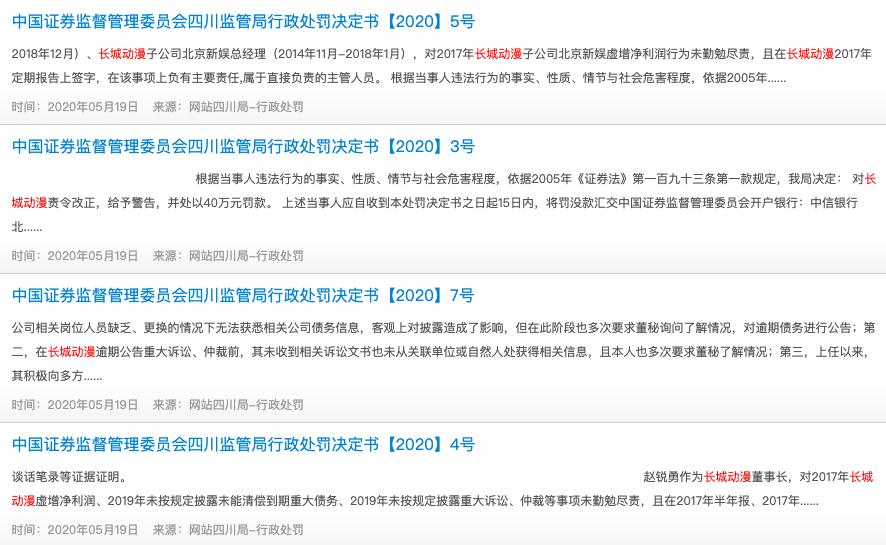 本周(5月26日),长城国际动漫游戏股份有限公司(以下简称“长城动漫”)披露《关于收到行政处罚决定书的公告》显示,因为涉及定期报告虚增净利润,未按规定披露未能清偿到期重大债务,未按规定披露重大诉讼、仲裁,公司和6位涉及到的高管人员均收到四川证监局开出的“罚单”。