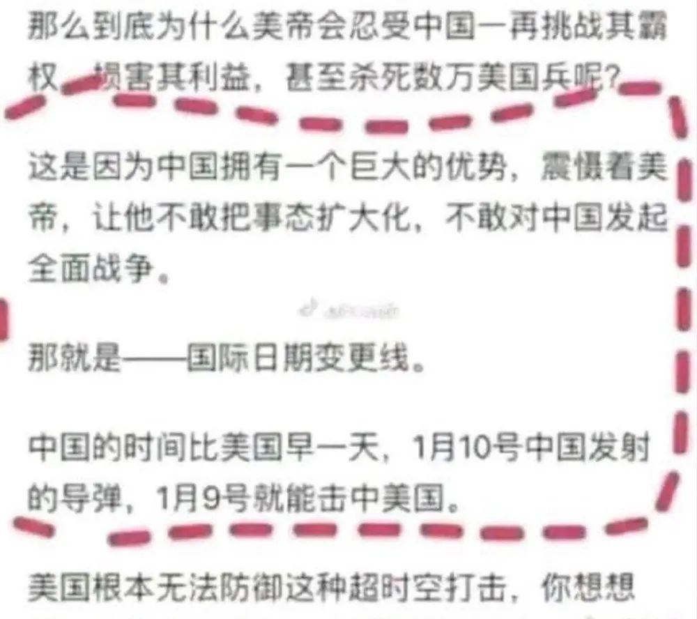 再比如,他说中国占有时区优势,可以超时空打击美国,今天发射一枚导弹,美国昨天就会被打中.....