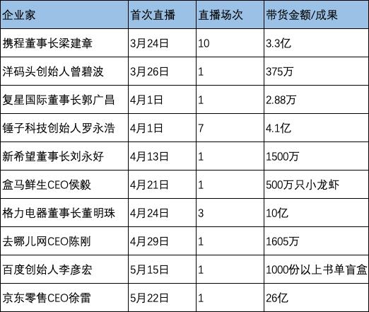 最早尝鲜的携程董事长梁建章已在抖音、快手、微信小程序等平台完成了十余场直播;自带流量的“网红企业家”董明珠三场直播下来,已为格力电器带货超过十亿。除此之外,百度创始人李彦宏、去哪儿网CEO陈刚、盒马鲜生CEO侯毅、京东零售CEO徐雷等一众企业家也纷纷上车,效果各不相同。