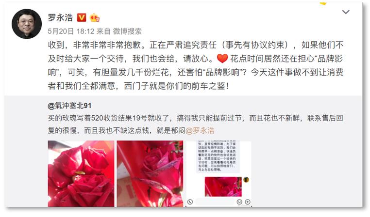 出现翻车后,罗永浩会在微博接连转发用户投诉信息,并附上道歉和补救措施,丝毫不遮掩。在小龙虾货品被消费者质疑时,他一天转发了27条用户的微博,每一条都详细做出回应。这次“520鲜花门”,他也翻了多位用户的牌子,一一回复。