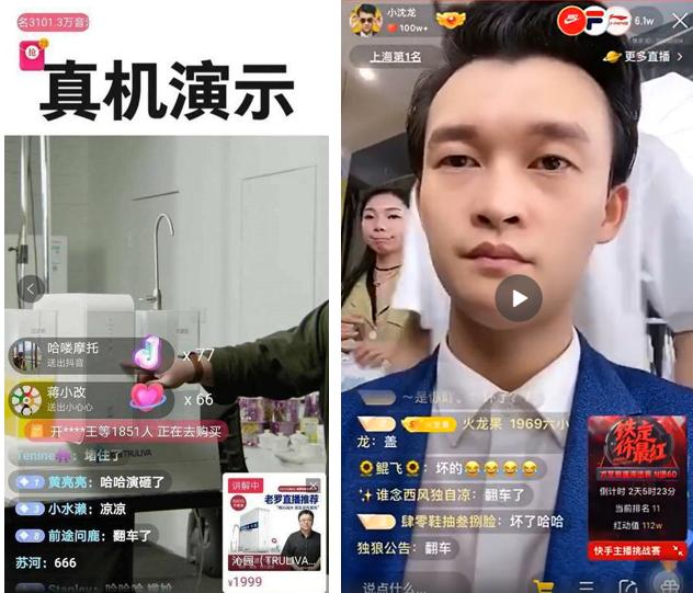(左为罗永浩演示净水器;右为小沈龙展示榨汁机。图片来源:各主播直播间)