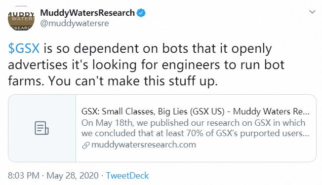 继5月18日浑水发布针对$跟谁学(GSX.US)$的做空报告之后,北京时间5月28日晚间,浑水发布第二弹,称其坚持认为,跟谁学存在巨大的欺诈行为,几乎是一个空壳。该机构指出,跟谁学对第一弹的回应是在混淆视听,并且更加滑稽的是,跟谁学公开招募工程师帮助其运营机器人农场,浑水在本次报告中展示了这一点。