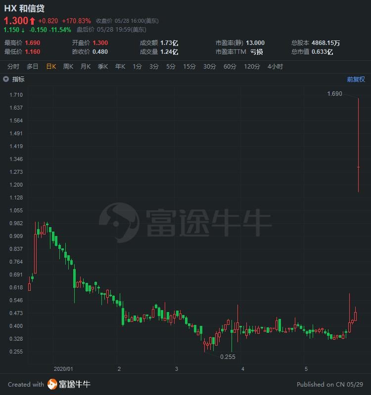 和信贷盘中一度涨超200%,收涨170.83%,报1.3美元。