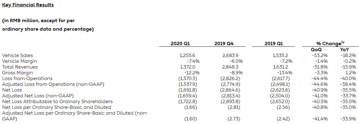 $蔚来(NIO.US)$于美股盘前公布财报:第一季度营收13.7亿元,市场预期16.7亿元,同比下滑16%;净亏损17.23亿元,市场预期亏损22.5亿元,去年同期亏损26.5亿元;调整后每ADS亏损1.6元;毛利率为-12.2%;交付3838辆汽车;第一季度汽车销售额12.556亿元,去年同期15.35亿元。