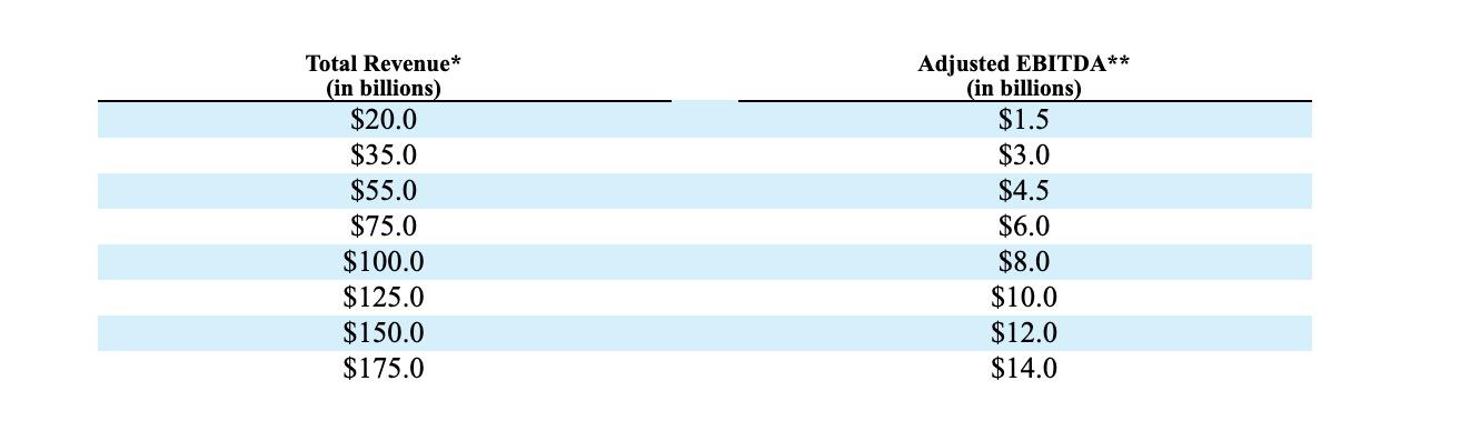 要达到下一阶段奖励,特斯拉必须再增加500亿美元的平均市值、35亿美元的收入和30亿美元的调整后EBITDA。