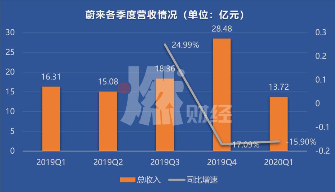 这份截至3月31日的2020年第一季度财报显示,营收13.72亿元,低于市场预期的16.7亿元。营收增速上,同比降低了15.9%,环比降低了51.8%,相比上市后首份财报的营收已经达到14.7亿元,可以说蔚来一夜回到解放前,本季度成为上市以来营收最少的一季。