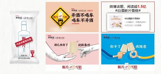 举个例子,去年很火爆的断片雪糕,联合泸州老窖推出,产品开发结束后,配上“断片”的名字,勾起很多消费者的购买欲,当时在传播层还做了很多话术,比如“开酒不喝车,喝车不开酒”、“酒有了,说故事吧”、“你干了,我随意”等,把喝酒场景移接到雪糕上,在网络上被人们热烈讨论。当时在微博就达到了1.5亿阅读,很火爆。