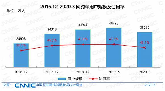 今年4月28日,中国互联网络信息中心发布第45次《中国互联网络发展状况统计报告》(以下简称 《报告》)。《报告》数据显示,2018年后,我国网约车用户规模增、用户使用率都增长放缓。其中,2019年6月和2018年12月相比较,用户规模只增长了0.3%,而2018年12月与2017年同期相比,这个数据是2.5%。另外,受疫情影响,截止2020年3月,网与车用户为3.6亿,下滑了约7%。