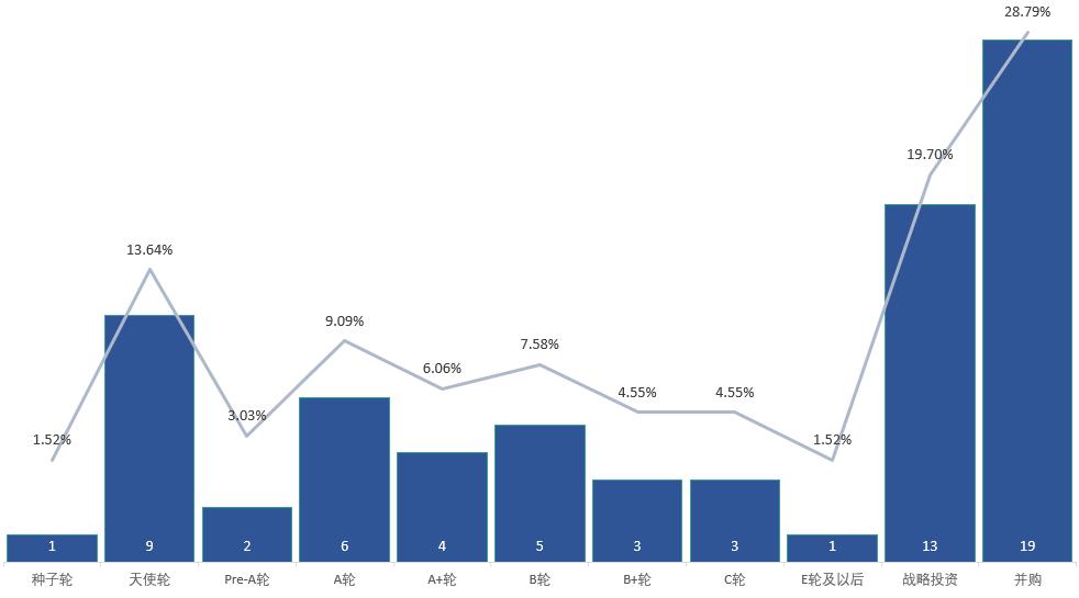 从融资轮次看,项目集中在早期项目、战略投资和并购,其中并购达到19笔,战略投资达到13笔,而天使轮和泛A轮融资分别达到9笔和12笔,相较上周而言早期项目的关注度有所降低。