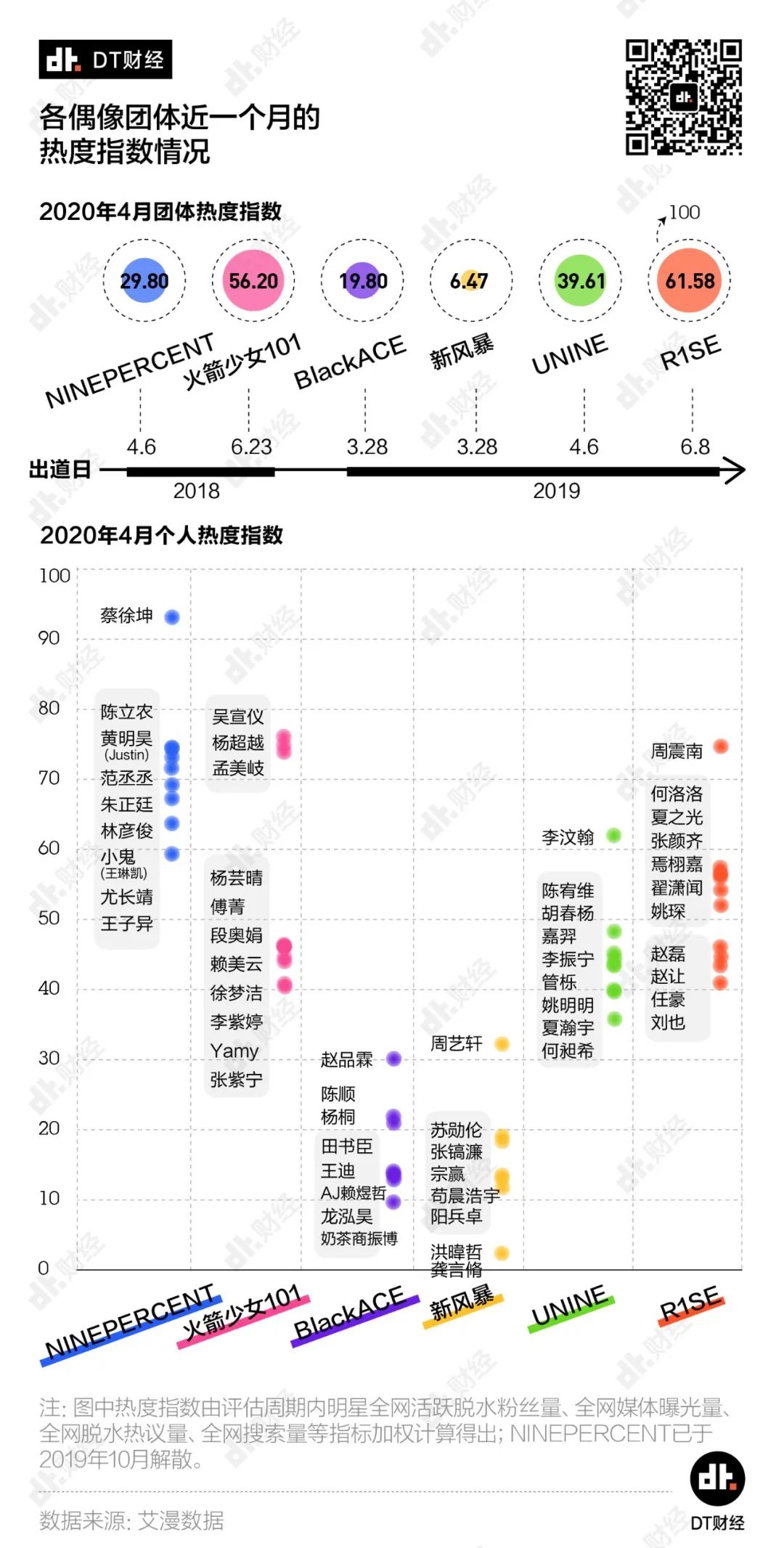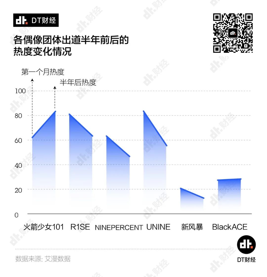 从结果上来看,我们就看到以火箭少女、R1SE为代表的团体,在成团后的整体热度运营较强。而从《偶像练习生》中走出来的NPC,作为初代“101”式男团,却因为“无团活”、“不营业”饱受粉丝诟病,难以将团体的影响力发挥出来。