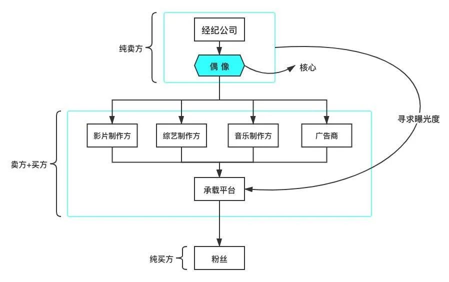 不同于韩国练习生制度,在国内市场对偶像团体未来发展发挥关键作用的角色,已经从经纪公司转变为这些具备强大资源整合能力的平台。平台在其中的角色,与制作方和广告商类似——既是卖方也是买方。