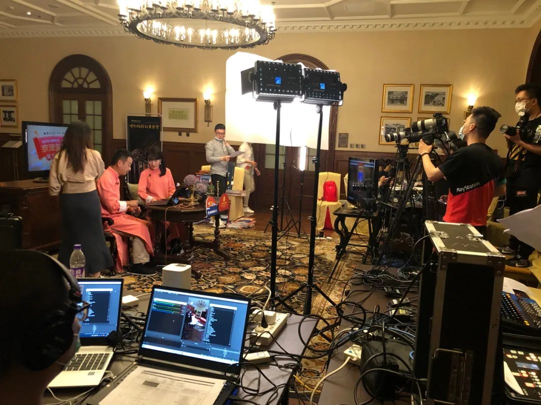 与第一次直播时的简陋装备相比,现在的直播设备已经更新了好几次,四台摄像机、两个补光灯列成一排,还有专门请来的拍摄团队。
