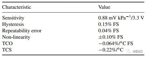 这款超小型且低成本的MEMS压力传感器芯片的灵敏度为0.88 mV·kPa⁻¹/3.3V、滞回系数为0.15%满量程(FS)、可重复性误差为0.04%满量程(FS)、非线性系数为±0.10%满量程(FS)。在没有任何其它热补偿方法的情况下,研究人员对该压力传感器芯片在-25℃至+85℃温度范围内进行100 kPa的满量程测试,结果表明该芯片的零点偏移温度系数(TCO)为-0.064%/℃满量程(FS)、灵敏度温度系数(TCS)为-0.22%/℃。