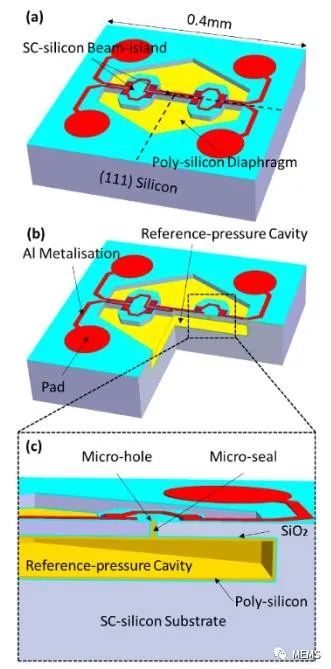该项研究论文展示了一种压阻式绝对压力传感器芯片,大小仅为0.4mm × 0.4mm,每颗芯片制造成本低至1美分——目前全球最小尺寸、最低成本。研究人员利用体硅下薄膜技术(thin-film under bulk-silicon technique),在集成压敏电阻的体硅梁岛结构下方形成非常薄但均匀的多晶硅压力传感膜片。梁岛加强结构有助于提升灵敏度、减小挠度、改善线性度。该压力传感器芯片采用一种新型的无疤痕微创手术(MIS)制造而成,并且该工艺与标准IC代工厂的工艺兼容,因此可有效降低成本。