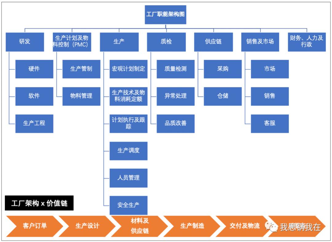 以下是一座典型工厂的部门架构、职能以及背后对应的价值链。