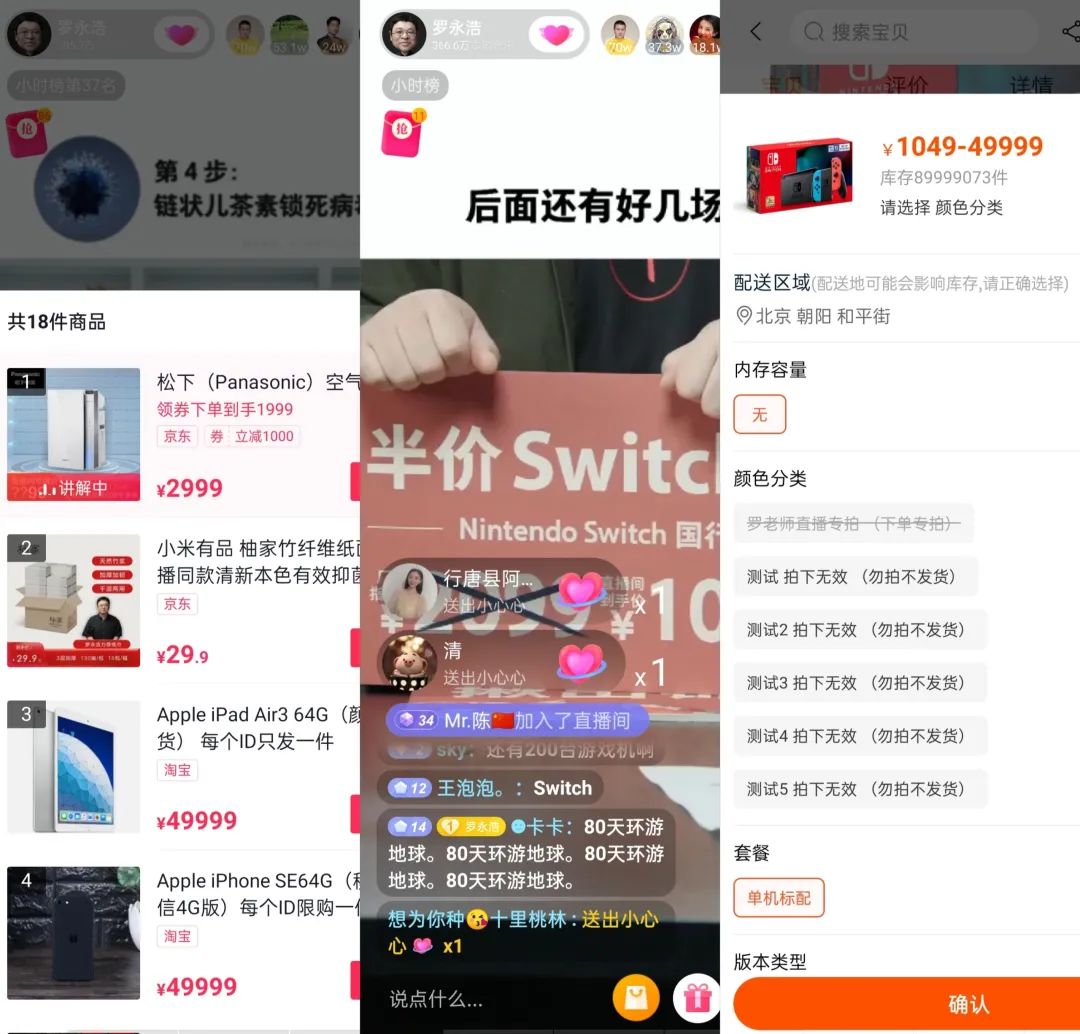 5月31日晚8点32分,刚上了半价iPhone SE 第二代的链接,商品就买不了了。当晚8点57分,半价1049元卖任天堂的Switch游戏机国行版,还是1秒空。6月1日凌晨1点55分,准备下播的罗永浩,突然发现还剩200个国行Switch游戏机,熬夜等到这个时间点的粉丝有了一些安慰和惊喜,商品很快在几十秒内被抢光。