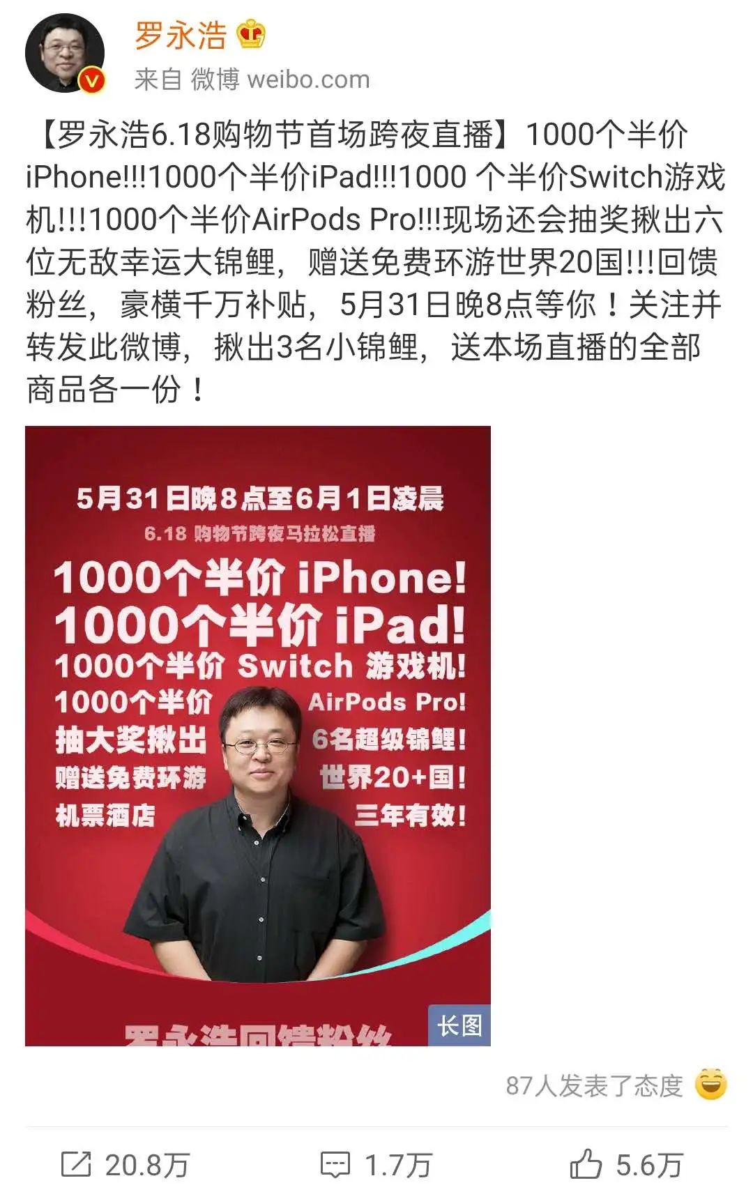 配合电商平台618大促活动,罗永浩在5月31日到6月1日凌晨进行了第八场直播,名为“618主题购物节”,他提前在微博预告了优惠力度和品牌,单条微博转发量超过20万。