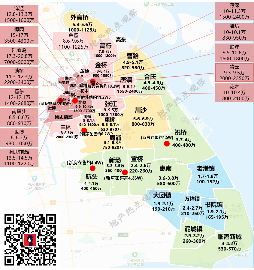 接下来是合庆、祝桥、航头、新场、临港新城、惠南、宣桥、泥城镇板块,天花板单价大多都在3-5W之间,总价基本在300-600W左右。其中宣桥主要是多年没有新房供应,未来一旦有新房入市,价格会在4W左右悬念不大;
