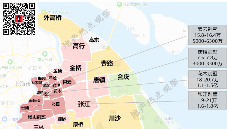 另外,浦东还有几个别墅聚集区——花木、碧云、张江、唐镇,其中花木板块以及张江板块接壤碧云的地区,别墅天花板价都已破亿。