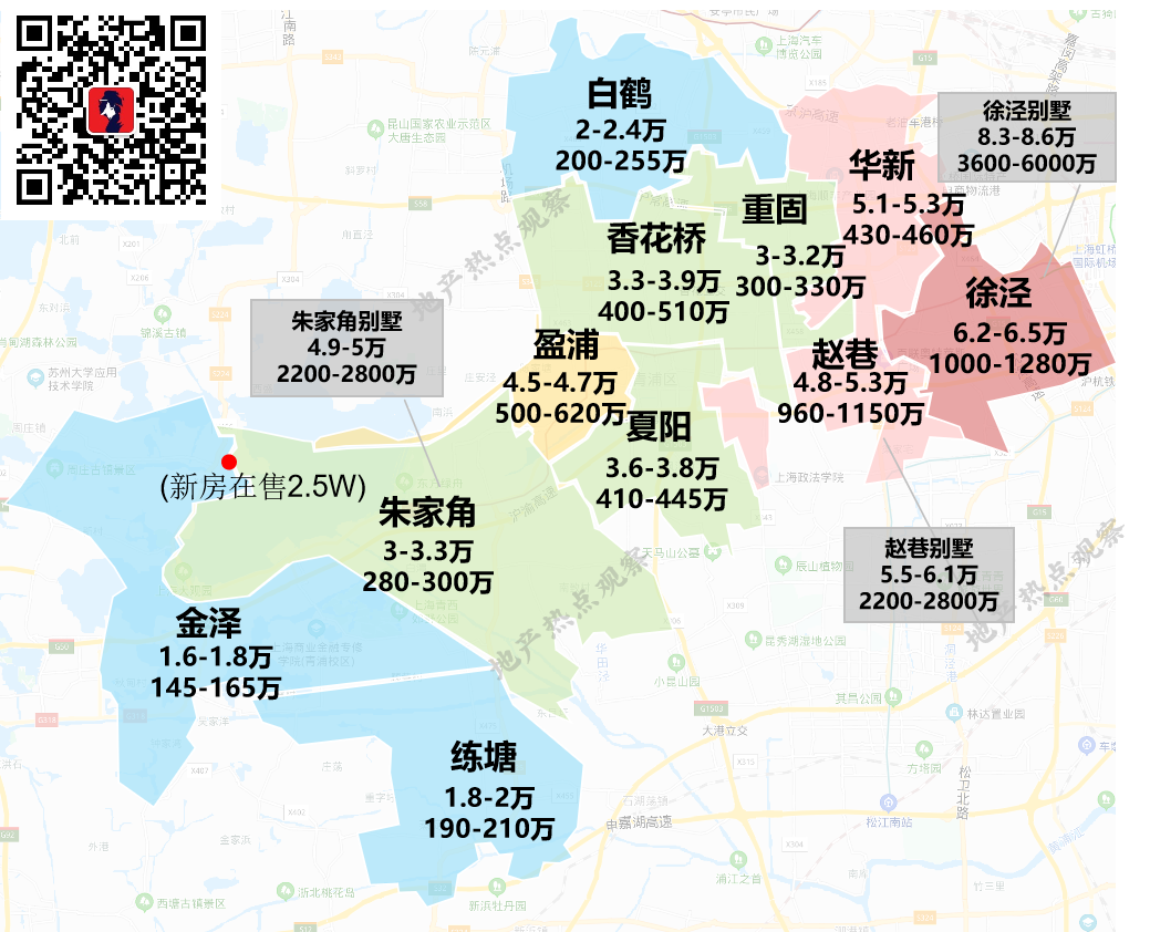 接下来便是重固、朱家角板块,天花板单价在3.3W左右,总价在300W左右。