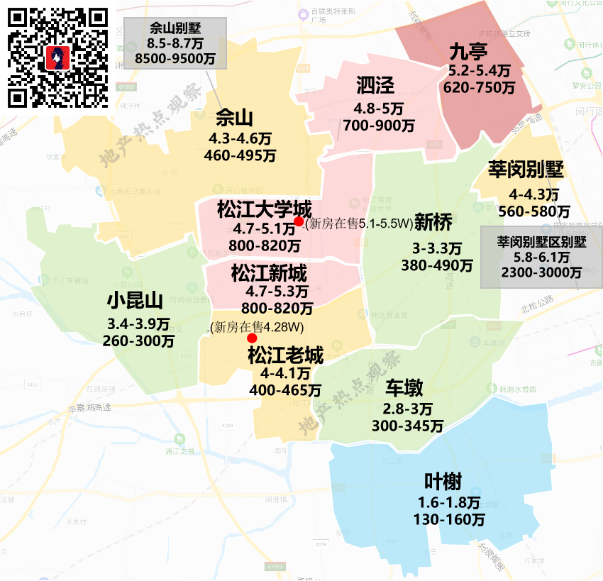 松江区天花板价在九亭板块,标杆项目单价都在5.2-5.4W左右;