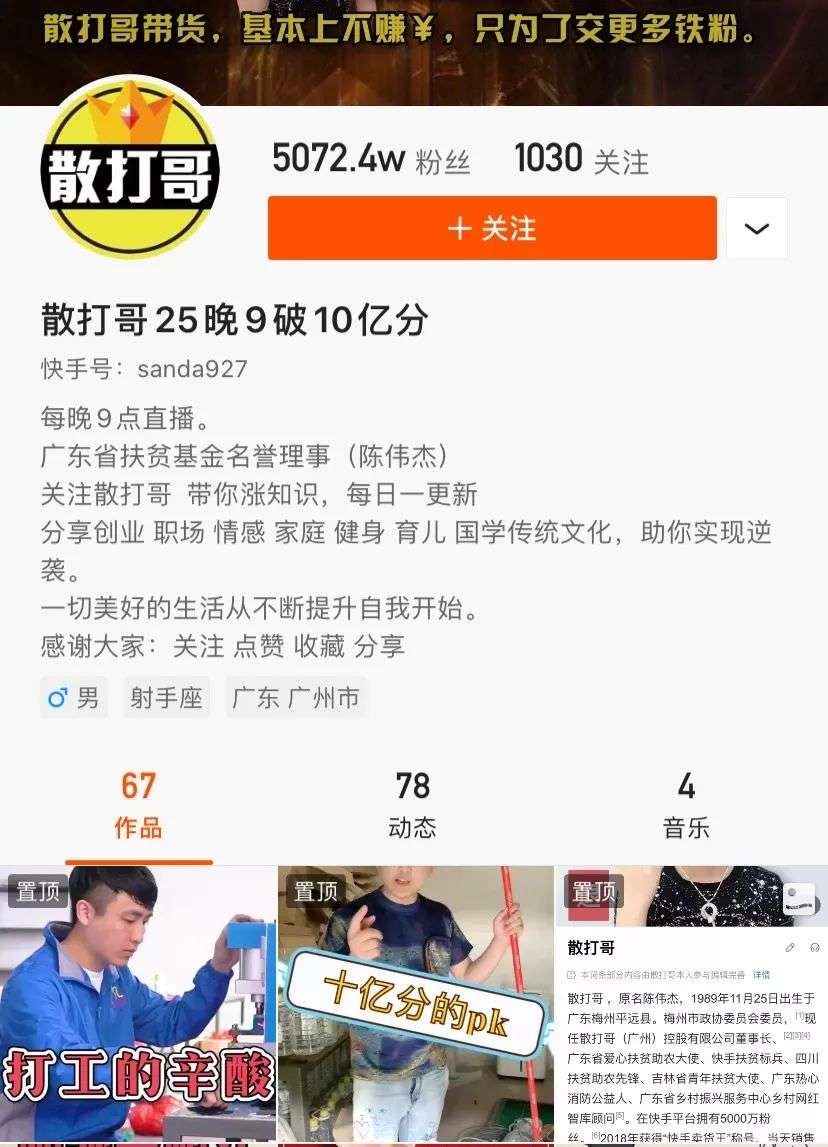 散打哥在快手上拥有5000多万粉丝,图源散打哥主页