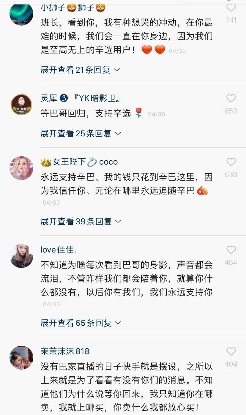 在直播评论区当中,很多粉丝打出了“辛巴”、“818”、“等王者归来”等关键字,蛋蛋含泪感谢师父师娘和818的家人们。