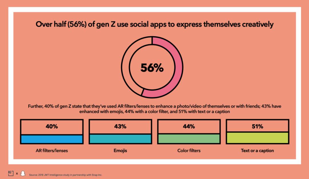 注:Z世代倾向于通过创造性的方式表达自己,他们在社交媒体上最常使用的是以上这四种方式 (来源:JWT Intelligence)