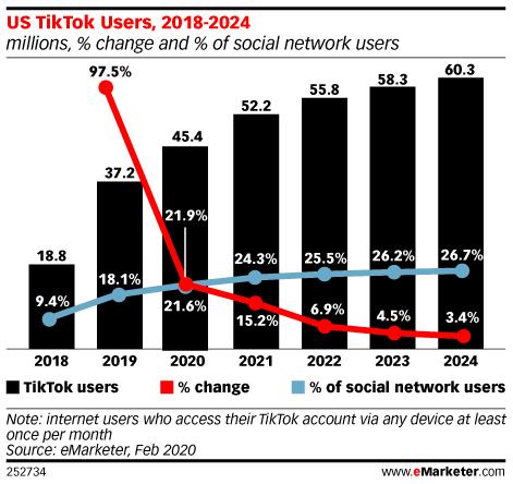 注:TikTok的美国用户占比与增长情况预测(来源:eMarketer)