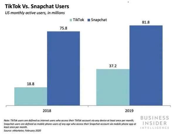 注:2018年与2019年TikTok与Snapchat的月活用户数对比情况(来源:Business Insider)