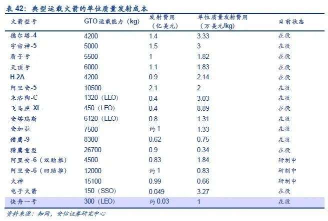 其次,除去NASA常年资金加订单的支持,SpaceX的成本屠杀能力同样是冠绝整个行业。作为“上天”的必需品火箭,安信证券测算SpaceX的猎鹰9号发射单位质量发射费用仅为0.75万美元/千克,SpaceX的发射报价直接拉低了整个行业一个数量级。