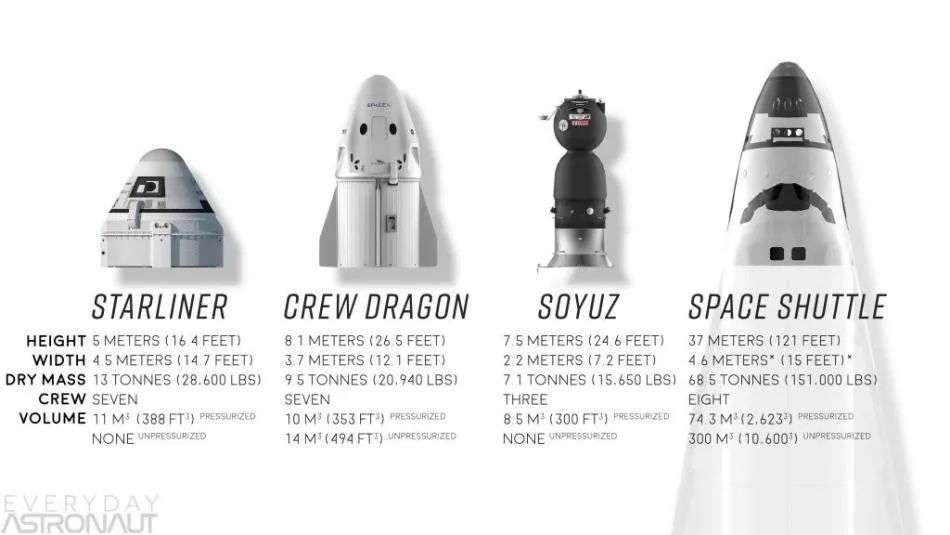 图:各国航天器对比(左二为龙飞船,左三为联盟号)