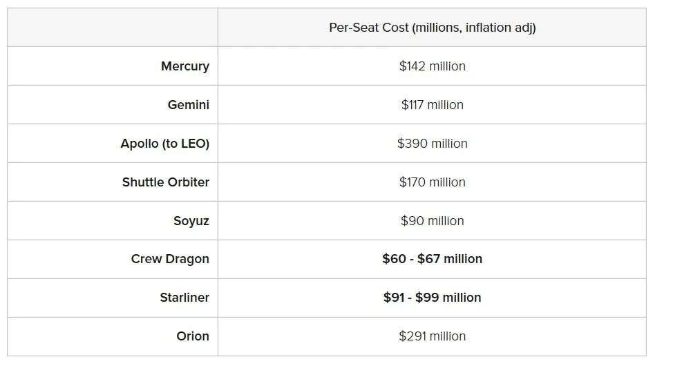 而根据planetary society分析师的测算,SpaceX此次载人航天的单座报价,同样是吊打各个前辈和对手的存在。