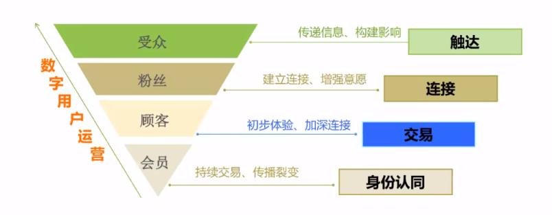 另外,我们要对此进行分级,只是产生初次触达的用户叫受众,产生有效的二次连接的用户叫粉丝,产生交易的用户叫顾客,有了身份认同的用户叫会员。这是立体化的用户定义。