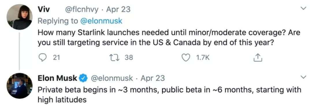 60颗卫星被送上太空那天,马斯克发了一条推特,公布了卫星互联网计划的最新目标:三个月后开始Starlink内测,六个月后开始公测。