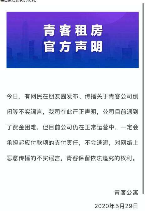 青客公寓发表官方声明称,公司目前遇到了资金困难,但目前公司仍在正常运营中,一定会承担起应付款项的支付责任,不会逃避,对网络上恶意传播的不实谣言,青客保留依法追究的权利。