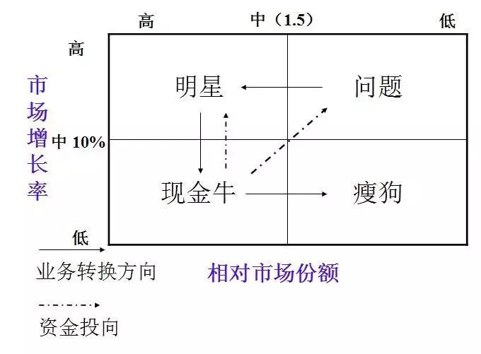 提出“波士顿矩阵”理论的布鲁斯•D•亨德森说:“任何产品,最终不是变金牛,就是变狗”。企业的产品策略,就是要让问号变明星,明星变现金牛,再用现金牛产生的现金流支持问号和明星业务,同时,还要把变成狗的业务干掉。