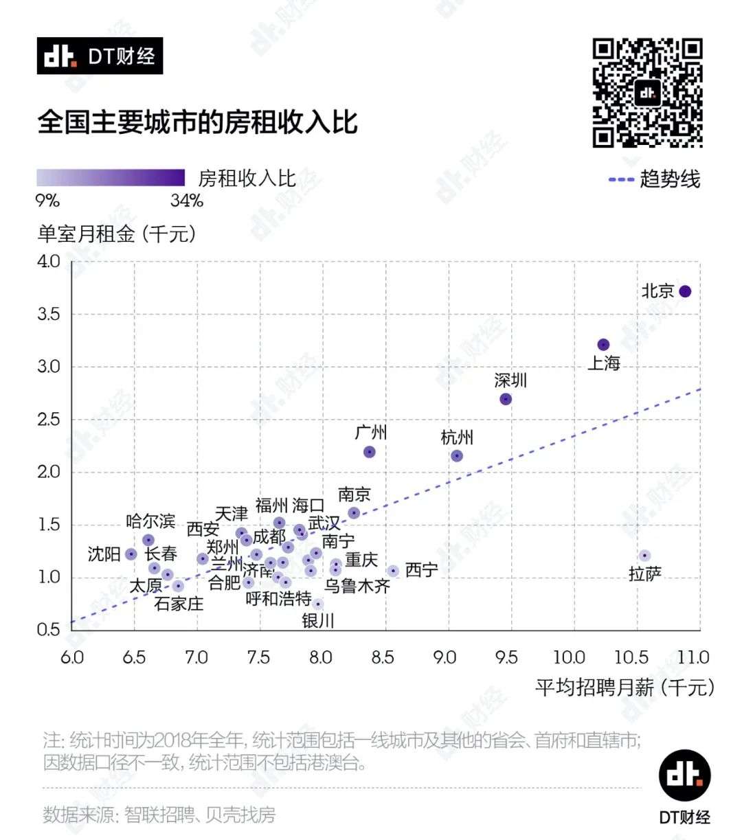 在一线城市,每个月拿出30%左右的薪水来付房租是常态——北京的平均招聘月薪为10879元,平均单室月租金为3716元,房租收入比(房租/月薪)高达34%。深圳和广州也分别达到29%和26%。