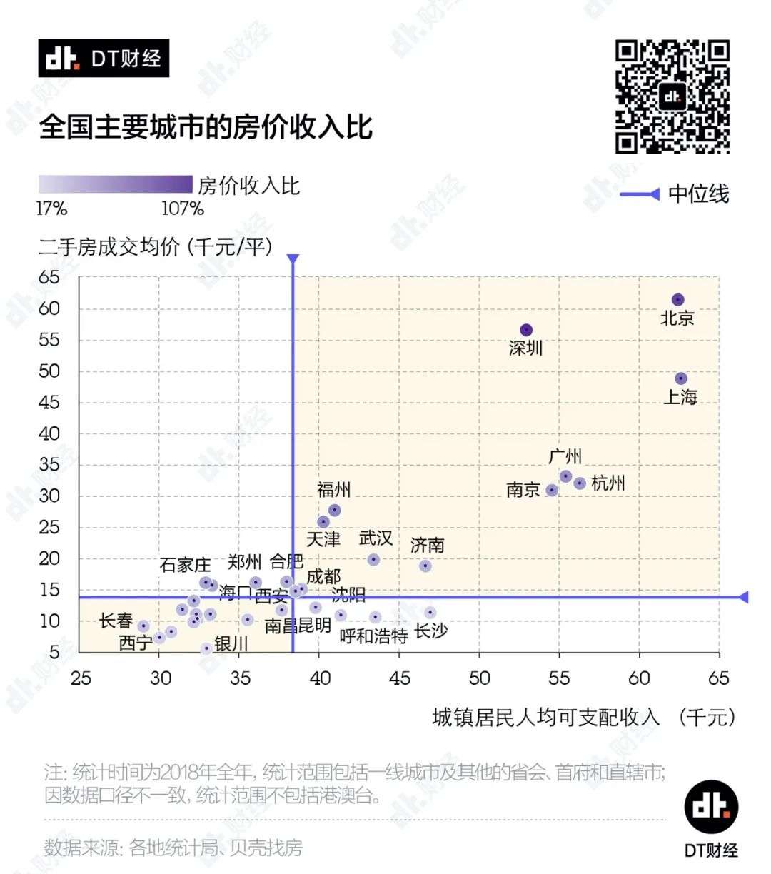 高收入、低房价的城市有长沙、呼和浩特、沈阳和昆明。长沙二手房成交均价为11471元/平米,城镇居民可支配收入为46948元/年,房价收入比为24%,相当于居民一年的可支配收入够买四平米的房子。