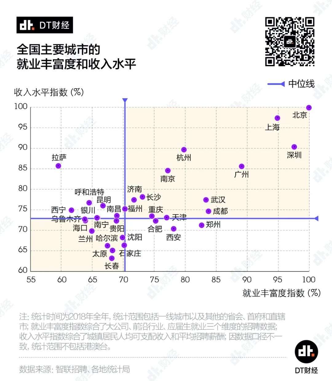 长春、太原、哈尔滨、沈阳、兰州、乌鲁木齐、海口、贵阳、南宁、银川则躺在工作机会少、收入水平低的“双低”区间里。
