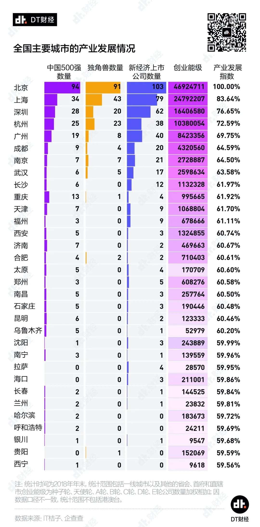 从产业发展来看,一线城市强者恒强,无论是中国500强数量、独角兽数量、新经济上市公司还是创业能级(各轮次创业公司的数量加权相加所得),都全面领先于绝大多数对手。省会中仅有杭州异军突起,拥有媲美一线的实力,甚至已超广州。