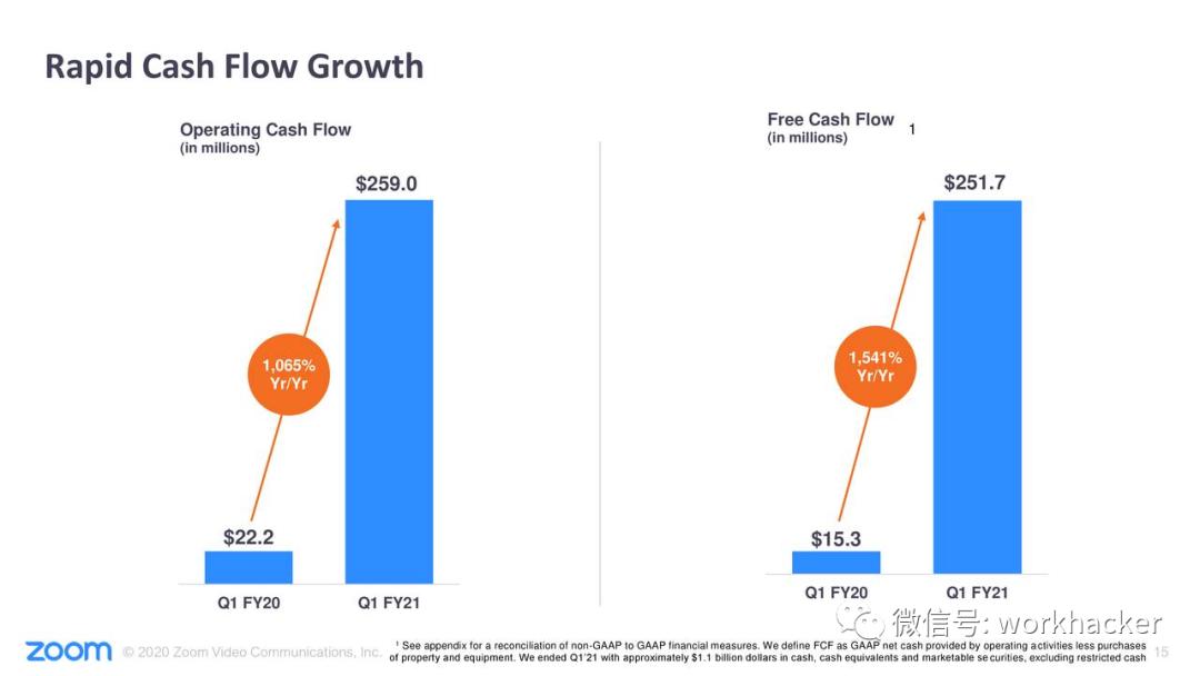 疫情期间带给Zoom的付费用户增长非常明显。无论从总体营收还是现金流来看,都非常惊人。就在三个月前,Zoom的收入仅为1.883亿美元,还不如最近三个月的自由现金流多。与其他SaaS软件公司经常通过并购来换取较大增长不同的是,Zoom的业绩数据纯粹是自有产品的有机增长。